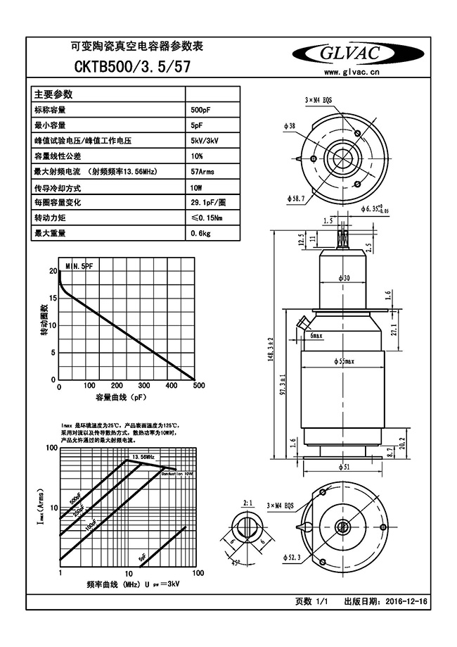 CKTB500/3.5/57可变陶瓷高压真空电容器采用陶瓷外壳、真空介质、具有耐压高、体积小、Q值高、性能稳定可靠、价格低廉等特点,广泛用于感应加热、介质加热、通讯、广播等设备。